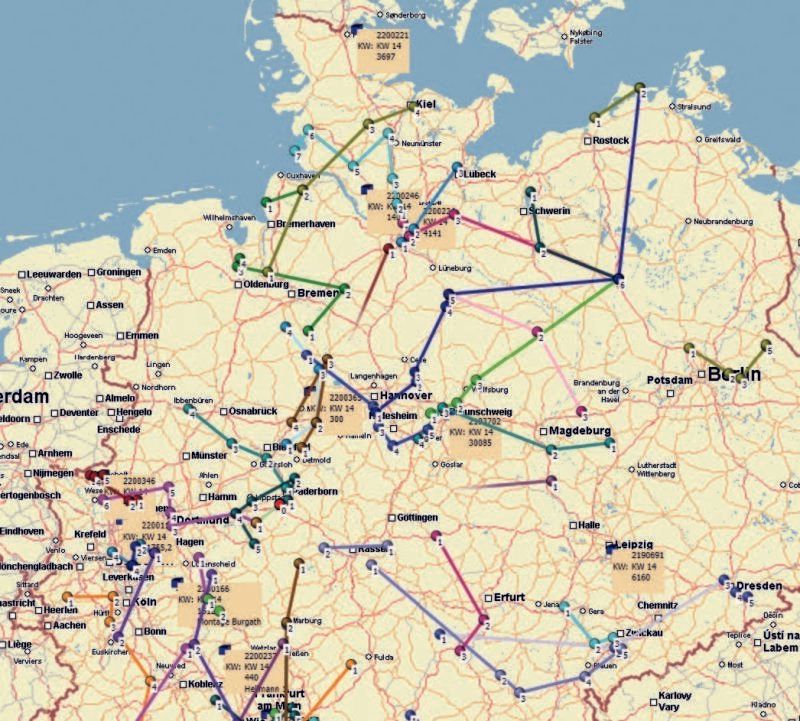 Wir planen die Auslieferung unserer Geräte computergestützt, damit wir die effizienteste Route unter Berücksichtigung der Lenk- und Ruhezeiten zusammenstellen.