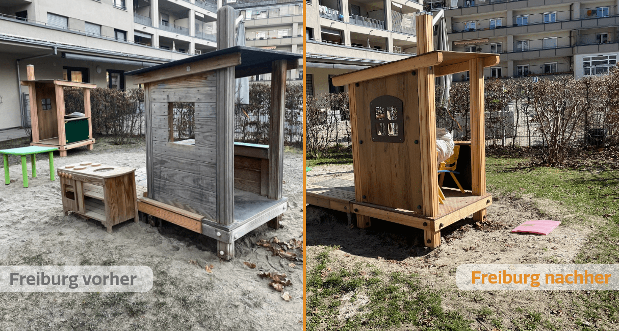 Auch auf dem Stadtteilspielplatz in Freiburg war die Zeit reif für eine Erneuerung. Die beliebte „Backstube“ war über die Jahre stark beansprucht worden – geliebt, aber nicht mehr sicher. Statt aufwendig zu planen und komplett neu zu bauen, entschied man sich für eine nachhaltige Lösung: