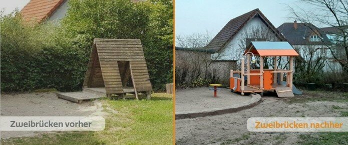 In Zweibrücken wurde ein verwittertes Zelthaus durch ein farbenfrohes Spielhaus ersetzt. Und das, ohne aufwendige Umbaumaßnahmen – denn das neue Spielgerät wurde einfach auf die vorhandenen Pfostenschuhe gesetzt.