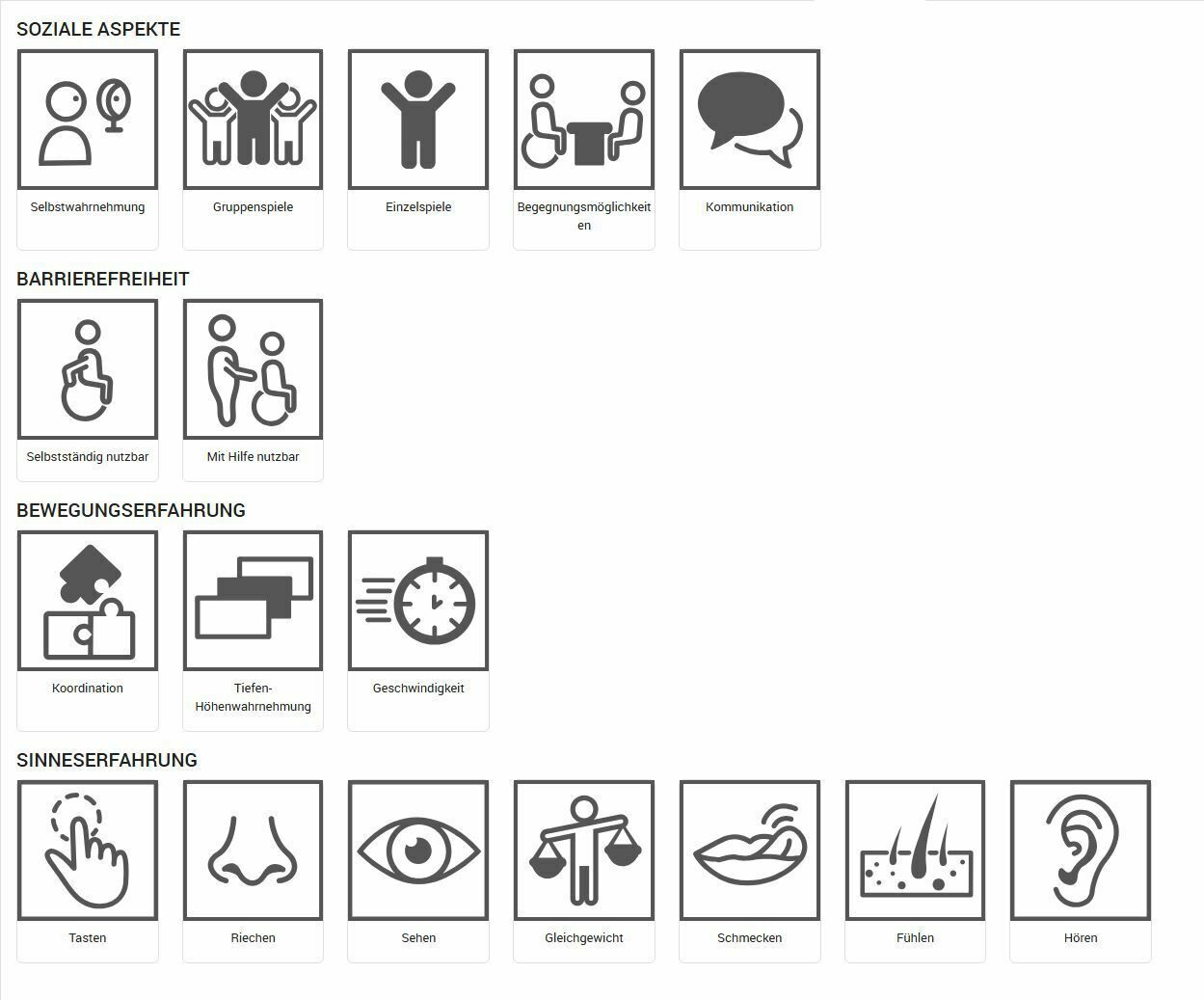 Um die Auswahl des richtigen Spielgeräts zu erleichtern, sind unsere Datenblätter mit Piktogrammen versehen. Diese Piktogramme geben auf einen Blick Auskunft darüber, welche Sinneserfahrungen, Bewegungserfahrungen und sozialen Aspekte das jeweilige Gerät fördert. Durch eine schnelle und klare Übersicht können Sie gezielt nach Geräten suchen, die bestimmte Fähigkeiten ansprechen und fördern.